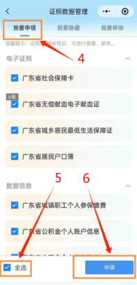4、选择“我要申领”,同时打勾“全选”,点击“申领”。