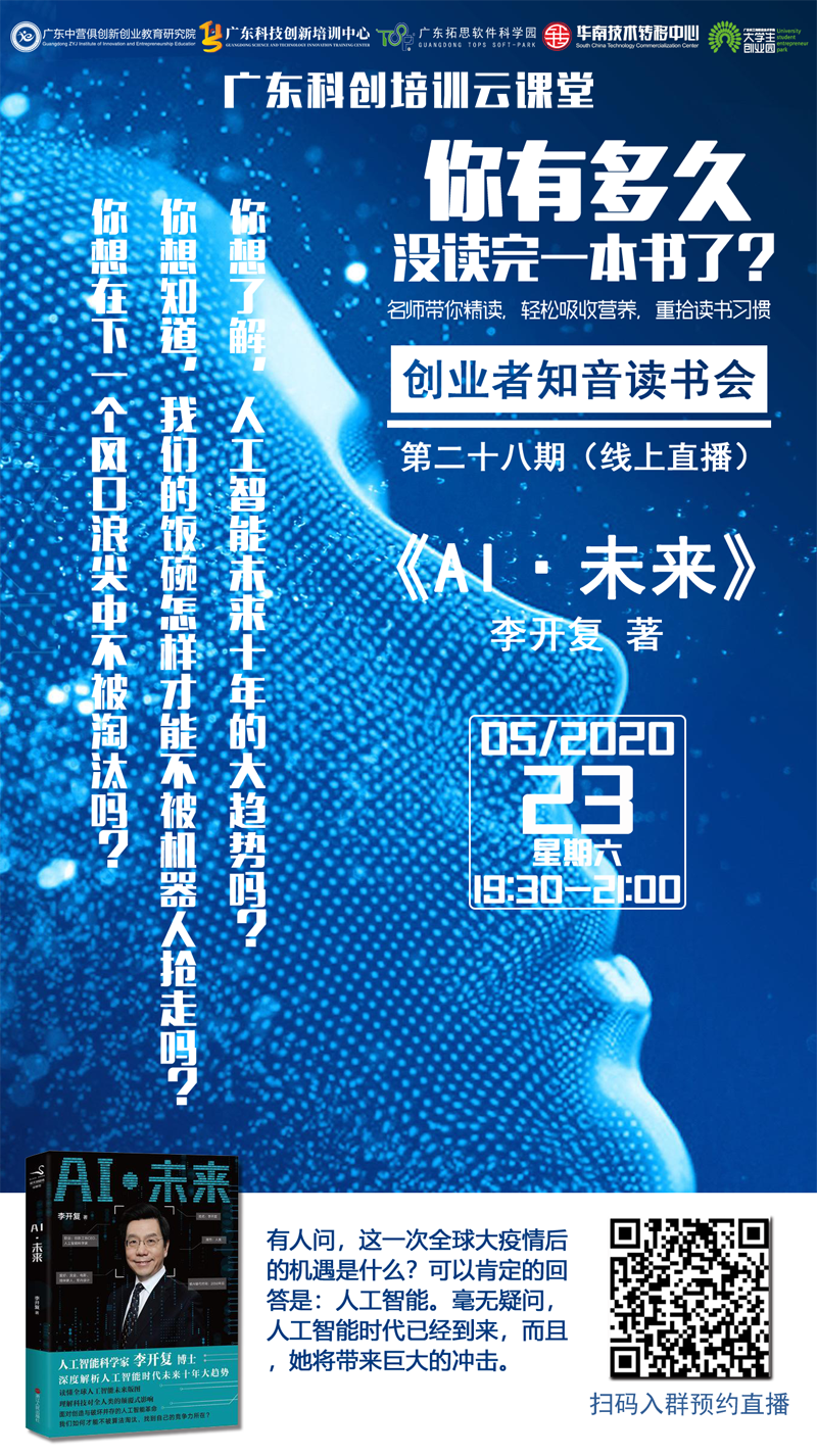 创业者知音读书会第28期 时间:5月23日(周六)19:30-21:00 书籍:《AI•未来》(李开复) 本期读书会将分享人工智能未来十年的大趋势以及人们如何在风口浪尖中保持竞争力!!欢迎感兴趣的朋友扫码入群预约直播哦