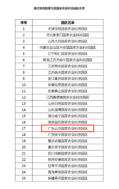 6月1日,科技部官网发布了《关于公布第九批国家农业科技园区验收结果的通知》,公布了25个国家农业科技园区的验收结果,其中,广东云浮国家农业科技园区顺利通过验收。
