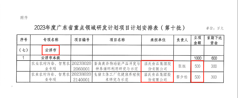 近日,省科技厅印发了《关于下达重点领域研发计划(第十批)项目计划的通知》(粤科资字〔2023〕121号),全省共有56个项目获批立项。其中,我市温氏食品集团股份有限公司申报的农业农村污染防治、智慧农业专项“畜禽废弃物功能产品开发与种养循环利用研究与示范”“生猪立体工厂化健康养殖技术研究与示范”2个项目榜上有名,每个项目获财政资助500万元,共1000万元。