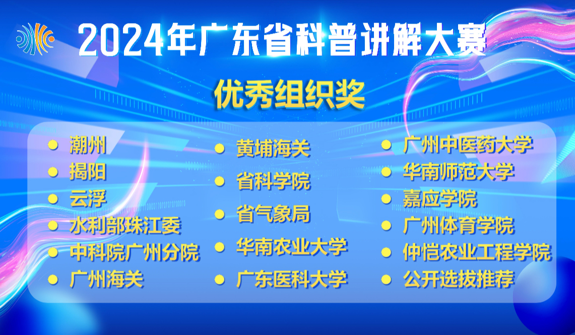 广东省科普讲解大赛是由省科技厅联合省教育厅、省科协共同举办的全省性科普大型赛事,旨在为科普工作者、科普爱好者打造培养技能、展示才华、交流学习的平台。全省共有53支代表队、279名选手参加省决赛,其中33名代表队参评优秀组织奖。