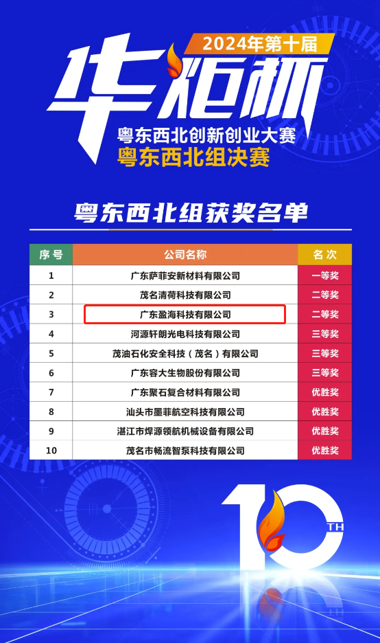 近日,第十届“华炬杯”粤东西北创新创业大赛粤东西北组决赛在清远市华南863科技创新园举行。我市国家高新技术企业、科技型中小企业广东盈海科技有限公司(简称“盈海科技”)的参赛项目,在激烈的竞争中脱颖而出,荣获二等奖!