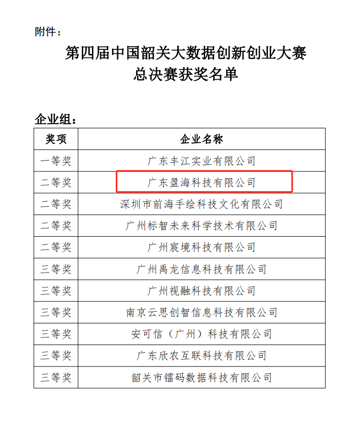 近日,韶关市举办第四届中国韶关大数据创新创业大赛,旨在面向全国遴选一批优秀的大数据企业、人才、团队、项目,通过以赛招商、以赛引才、以赛育产,为大数据领域创新型产业集群的打造、大数据科技成果和创新创业人才的转化落地提供支撑。我市国家高新技术企业、科技型中小企业广东盈海科技有限公司(简称“盈海科技”)的参赛项目,在激烈的竞争中脱颖而出,荣获企业组总决赛二等奖!