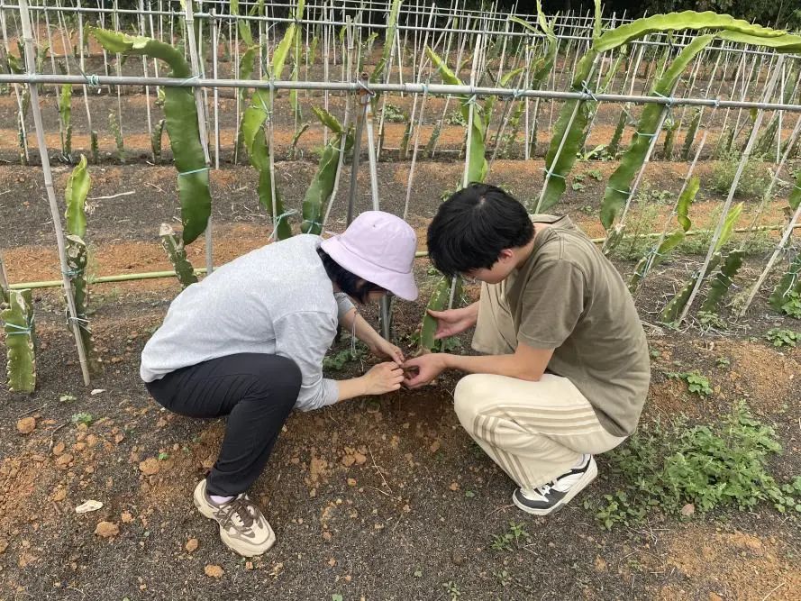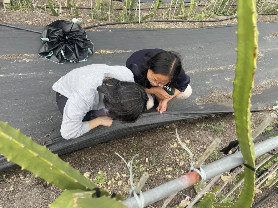 团队到广东恒华源智慧农业有限公司位于金鸡镇的火龙果种植基地现场调查,发现火龙果土传病害根结线虫发病较为严重。针对根结线虫病,特派员团队积极寻找解决办法与防治手段,筛选防治药剂,在种植基地开展田间防治实验,目前已完成施药,逐步跟进,找出最优防治策略与手段,进一步健全完善火龙果产业生产种植体系。在施药过程中发现火龙果种植田内多处有红火蚁成群出现,特派员韩群鑫教授与颜珣研究员检查蚁穴位置,嘱咐实验调查人员与工人应注意防护,注意相关事项,强调基地对于红火蚁防治要引起重视,及时施用饵剂等防治药剂,并做好安全防护。