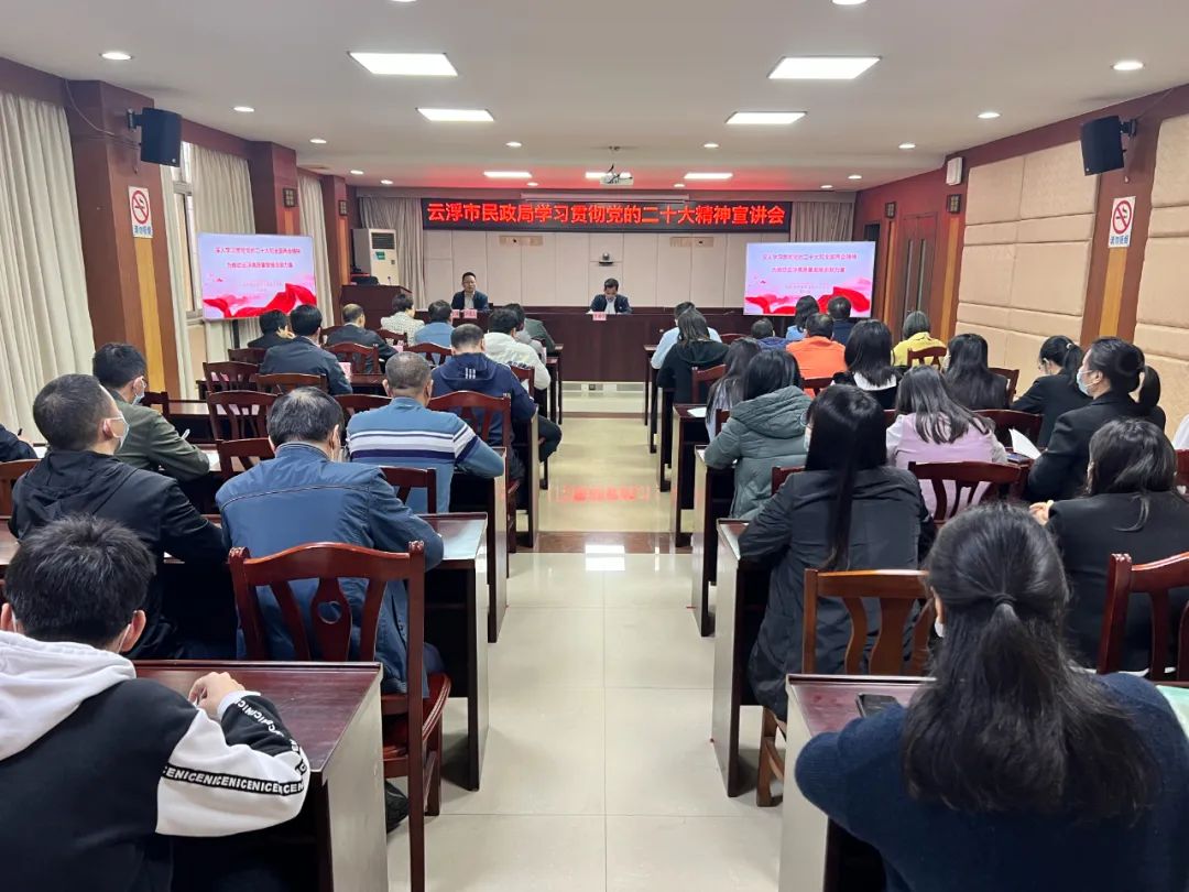 为深入学习宣传贯彻党的二十大精神,推动市民政局全体干部职工全面学习、全面把握、全面落实党的二十大精神,切实用党的创新理论武装头脑、指导实践,在全局上下凝聚起团结奋斗、踔厉奋发的强大力量,推动民政事业在高质量发展之路上取得新突破,创造新业绩。2023年4月2日,云浮市民政局召开学习贯彻党的二十大精神宣讲会,特邀广东药科大学马克思主义学院院长(书记)、市委宣讲团成员,华为大学签约讲师、广州市委培训中心、广州市政府公务员培训中心特聘教授刘小龙开展专题宣讲,市民政局党组书记、局长李德荣主持会议,局机关在家班子成员,三、四级调研员,各科室和下属事业单位全体党员干部职工参加会议。