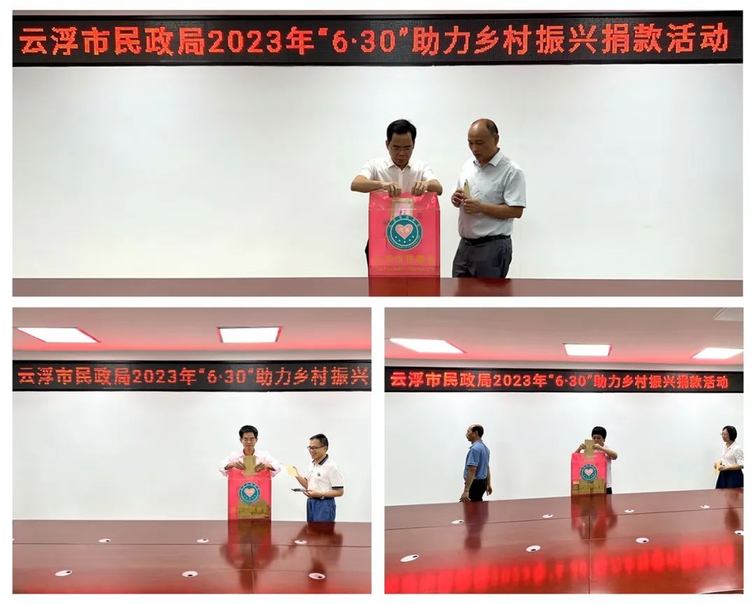2023年6月30日是第十四个“广东扶贫济困日”,为深入贯彻落实党的二十大精神和习近平总书记视察广东重要讲话重要指示精神,认真贯彻落实习近平总书记关于“三农”工作重要论述精神,以实际行动庆祝中国共产党成立102周年,携手巩固脱贫成果、助力乡村振兴,自2023年6月28日起,云浮市民政局及下属事业单位积极响应上级号召,纷纷开展2023年“6·30”助力乡村振兴捐款活动。活动主会场设在市民政局机关六楼党组会议室,并在市福利彩票发行中心、市福利院、市救助管理站等下属事业单位设立分会场组织干部职工开展捐款活动。 活动中,由局领导带头捐款,作表率,全体党员干部职工积极响应号召,踊跃参与捐款,现场气氛热烈,在民政系统内掀起爱心募捐热潮,进一步激发了广大民政干部职工积极主动参与社会公益事业的热情,在全市民政系统上下营造了乐善好施、助人为乐的良好氛围,以实际行动践行“民政为民、民政爱民”工作理念,为进一步促进我市慈善事业高质量发展,为巩固脱贫攻坚成果同乡村振兴有效衔接贡献民政力量,彰显民政担当。