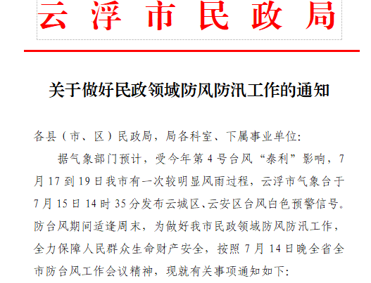 2023年7月16日中午印发《云浮市民政局关于做好民政领域防风防汛工作的通知》,要求各地民政部门、局机关各科室和下属事业单位要落实省委、市委主要领导批示要求,以“时时放心不下”的责任感,坚决扛起三防工作的责任担当,严阵以待做好民政服务机构台风防御工作,迅速开展灾害应急排查,全力保障人民群众生命财产安全。通知强调,要加强对本辖区养老机构、儿童福利机构、殡葬服务机构、婚姻登记机构、未成年人保护机构以及救助管理机构防风防汛的指导和检查工作。聚焦建筑结构、设施设备、周边地质环境、给排水系统等方面,对特困人员供养、儿童福利、救助管理、殡葬服务、养老服务等各类民政服务机构全面深入开展再排查,及时发现、整治各类安全隐患。要格外关注、关爱、关心困难群众,对分散供养特困人员、散居孤儿、留守老人、留守儿童、困境儿童及残疾人等重点群体,加强巡查探访,提高巡访频次。要坚持以大概率思维应对小概率事件,紧盯危险区域,从严从实从细做好防灾避险预案和安全转移准备工作,及时采取主动避险措施。要严格落实值班制度,如有险情应及时报告。