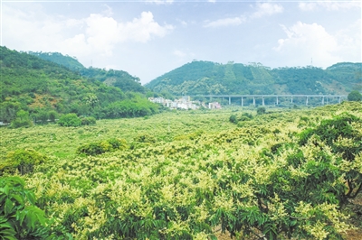 在该镇的无核黄皮种植基地,漫山遍野的无核黄皮果树郁郁葱葱,一簇簇花枝分结出数朵小花,有含苞待放的,有裂开吐蕾的,有花蕊凋谢的,淡黄色的小花绽放枝头。便民村委区屋村是该镇种植无核黄皮最多的村,村前屋后,田边山涧,放眼之处,漫山遍野的黄皮花点缀在青绿的山坡上,花的芬芳吸引了不少蜜蜂和蝴蝶闻香而至。