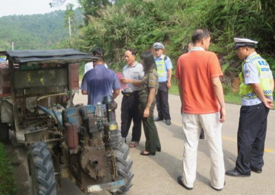 为贯彻落实省、市开展道路交通安全“夏季攻势”专项行动的精神和要求,做好国庆、中秋期间农机安全生产工作,促进我市农机安全生产,9月7日,云浮市农业局联合云浮市公安局,在云安区农业局、云安区公安交警部门的配合下,到云安区都杨镇开展“拖拉机道路交通安全联合执法检查专项整治行动”。执法采取定点稽查与流动巡查相结合的方式,对过往拖拉机等车辆进行集中检查,严厉查处无牌行驶、无证驾驶、假牌套牌、超速超载、非法载人、长期脱检等违法违规行为。行动共出动10人,警用车2辆、农机监理车2辆。通过开展拖拉机道路交通安全联合执法检查行动,有效震慑和打击拖拉机非法改装、无牌无证行驶、脱检漏审等违法行为,起到预防和减少道路交通事故和农机事故的作用,保障群众生命财产安全。