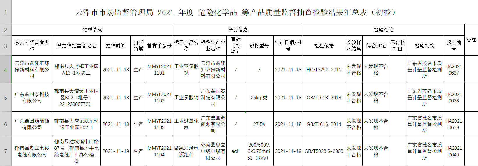 根据《云浮市市场监督管理局关于开展危险化学品及石材等产品质量监督抽查工作的通知》(云市监函〔2021〕355号)要求,云浮市市场监督管理局委托茂名市质量计量监督所于2021年11月对云浮市区域内危险化学品及电线电缆生产企业开展监督抽检工作。此次共抽取4家生产企业的4批次产品,经检验合格4批次,不合格0批次,不合格产品发现率为0,现将具体抽检结果通告如下(见附件1)