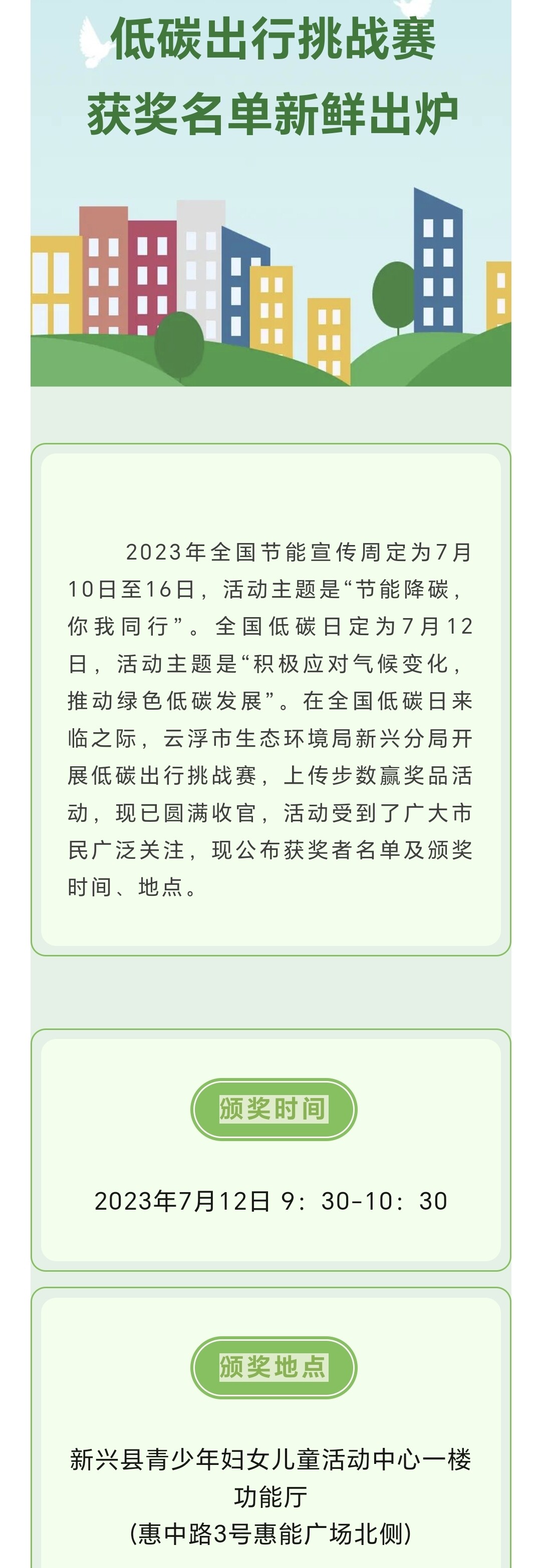 为倡导节能降碳和绿色发展理念,宣传节能降碳知识,引导广大群众积极响应绿色低碳的生活方式,7月4日到12日,云浮市生态环境局新兴分局开展以“积极应对气候变化,推动绿色低碳发展”为主题的2023年“全国低碳日”低碳出行挑战赛活动。