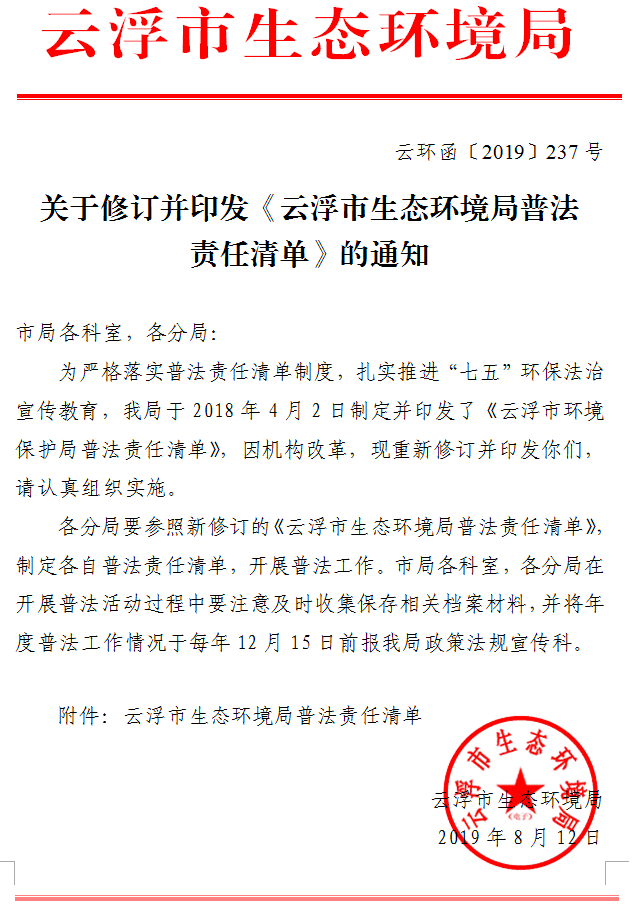 关于修订并印发《云浮市生态环境局普法责任清单》的通知