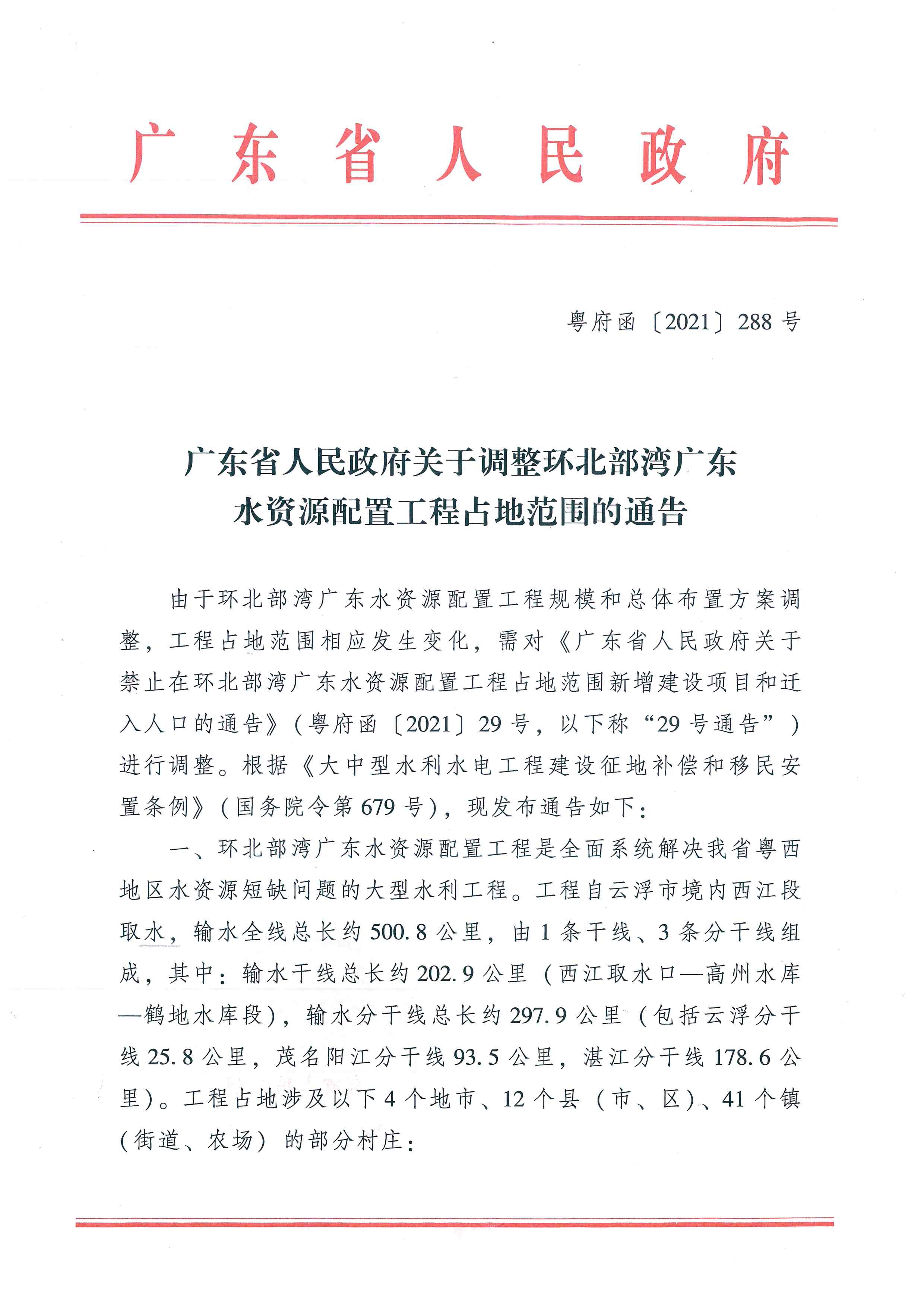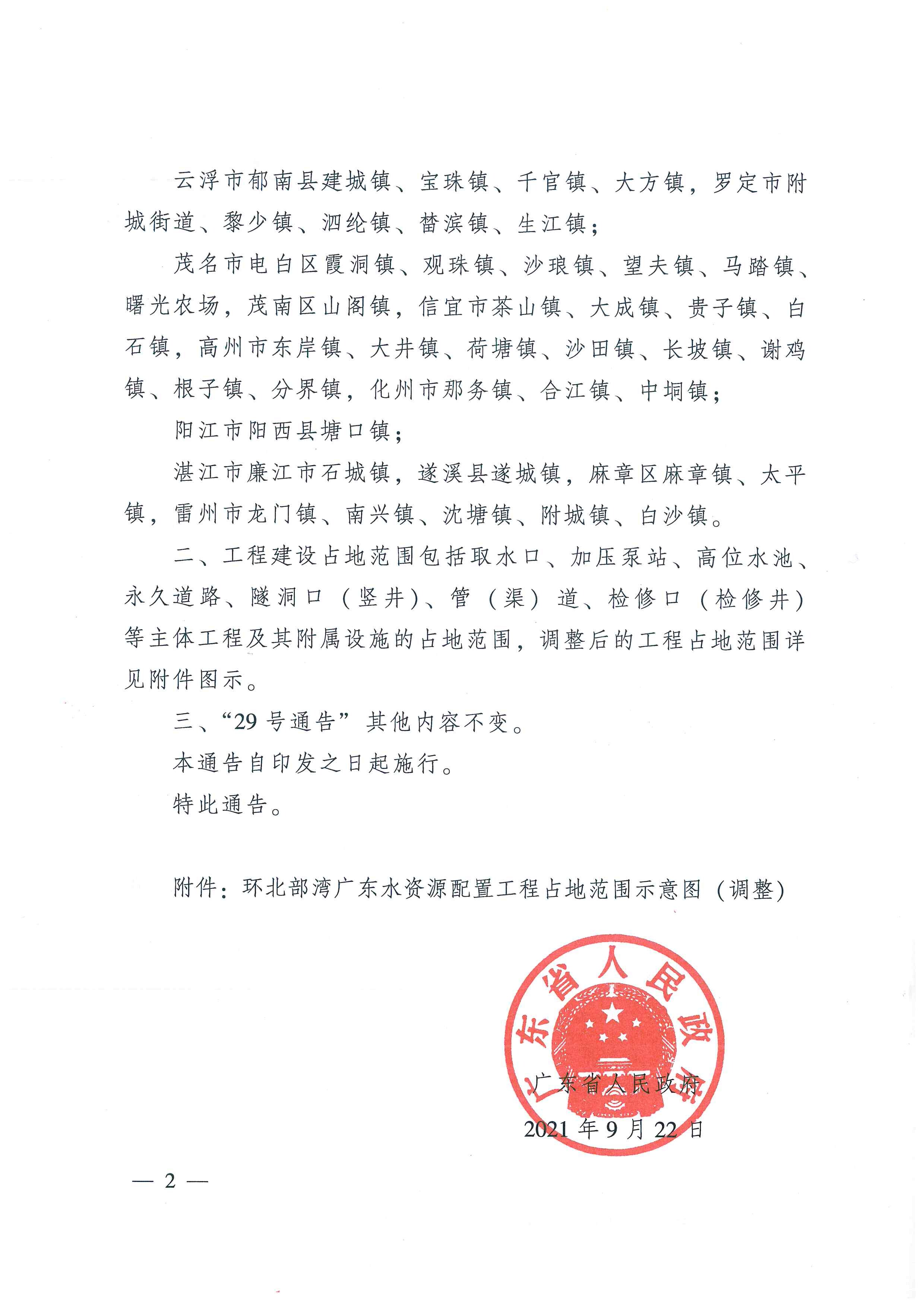 广东省人民政府关于调整环北部湾广东水资源配置工程占地范围的通告
