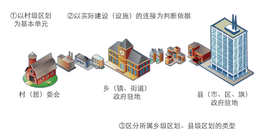 因此,城乡划分工作以村(居)委会等村级单位为划分对象,通过判断村(居) 委会驻地、乡(镇、街道)政府驻地、县(市、区、旗)政府驻地之间的实际建设连接情况,将我国的地域划分为城镇和乡村。图示如下: