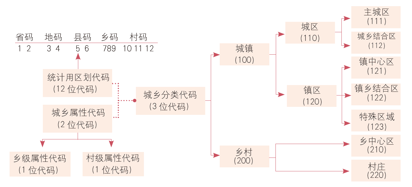 城乡划分工作主要包括编制统计用区划代码(第1—12 位)、城乡属性代码(第13—14位),以及转换生成城乡分类代码(第 15—17 位)三部分。图示如下: