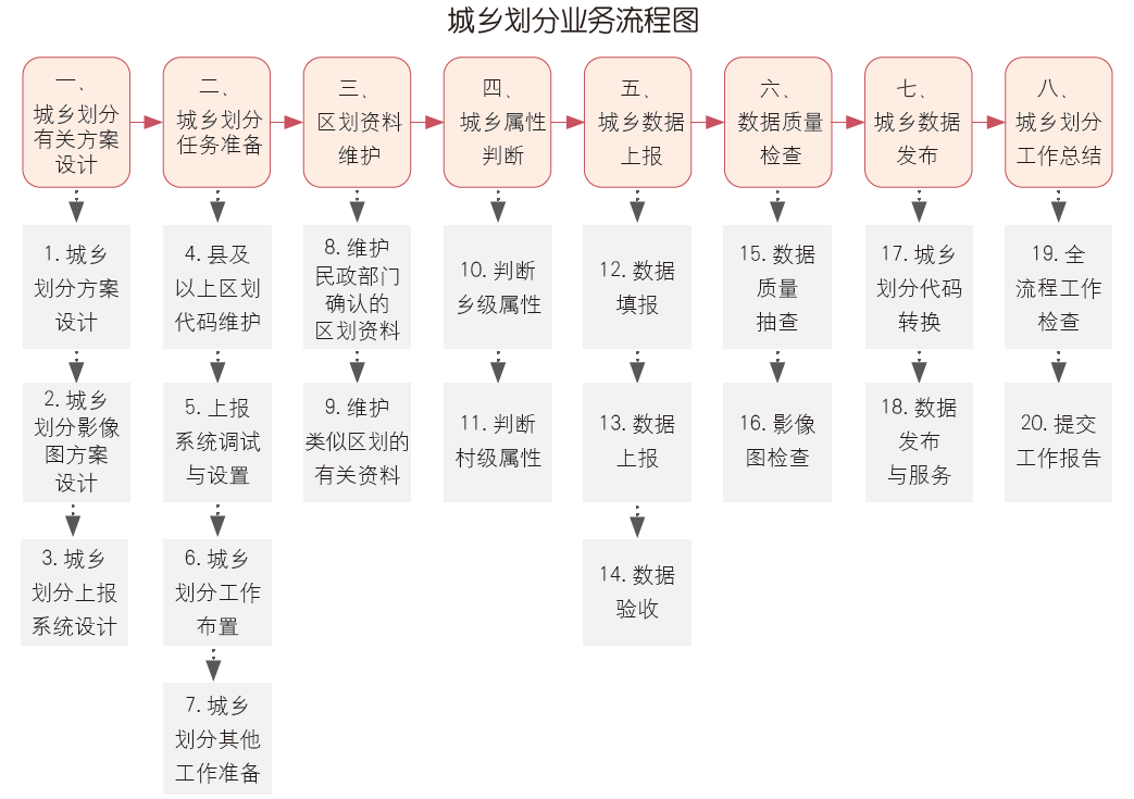 (五)强化质量控制。积极贯彻落实《国家统计质量保证框架》,2014 年制定《城乡划分质量控制办法》,将全流程工作分为 8 个阶段、20 个环节和 44 个关键节点,并于 2015 年将质量控制嵌入网报平台。图示如下: