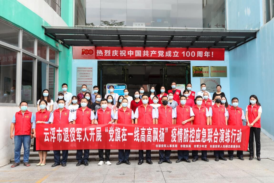 云浮市退役军人事务局、云浮市退役军人先锋志愿服务总队牵头组织开展“党旗在一线高高飘扬”疫情防控应急处置联合演练行动,旨在培训提升退役军人志愿者在疫情现场的应急处置能力、应急组织协调能力,做到人人知流程,岗岗会处置。