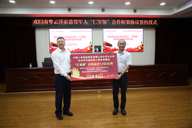 在仪式现场,双方共同签订合作框架协议,并进行公益保险捐赠,为退役军人代表赠送“仁军保”保险。“仁军保”公益项目,既是退役军人工作引进社会力量参与的有益探索,又是贯彻落实习近平总书记关于退役军人工作重要论述的具体举措,是关心关爱退役军人的实事好事。自2020年起,市退役军人事务局和中国人寿云浮分公司携手,启动了第一期戎归南粤云浮市退役军人“仁军保”公益活动。截至2022年底,累计为1837名安排工作和自主就业退役士兵赠送人身意外伤害保险,体现了央企爱国拥军的社会责任担当,得到了广大退役军人的一致好评。