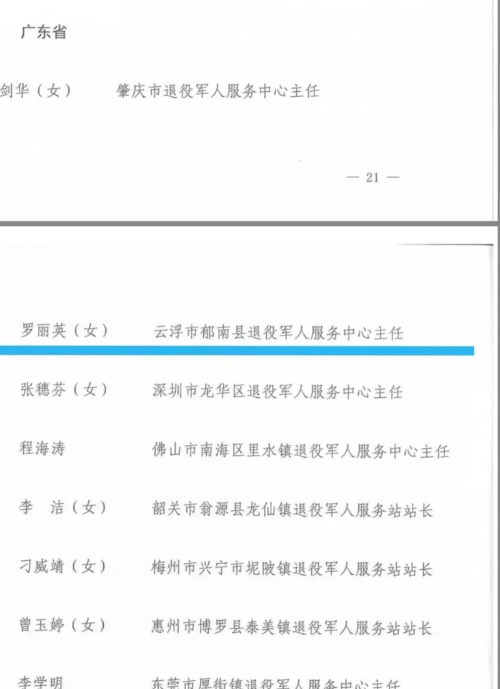 为表扬先进典型,弘扬奋斗精神,近期,退役军人事务部办公厅发布了2023年度全国退役军人服务中心(站)“百名优秀主任(站长)”名单,云浮市郁南县退役军人服务中心主任罗丽英榜上有名!