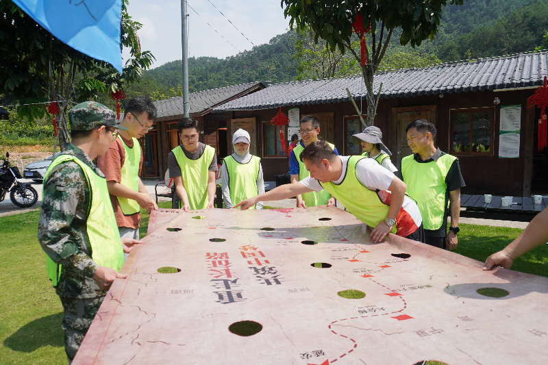 在为期半天的团建拓展训练中,参与活动的全体干部职工随机分组形成三个战队同场PK,在起队名、画队旗、定口号、做游戏的合作过程中,增进相互了解,全情投入拓展训练。此次拓展通过设置“重走长征路”“步步高升”“鼓舞飞扬”等集挑战性、知识性与趣味性于一体的比赛训练项目,考验团队默契度和配合度,引导队员培养团结协作、互助共赢的团队精神。比赛中,每个战队群策群力沉着应战,积极应对各种突发问题,与其他战队你追我赶、勇争上游,展现出退役军人事务系统干部职工无畏困难、勇于担当、敢于胜利的精神风貌。