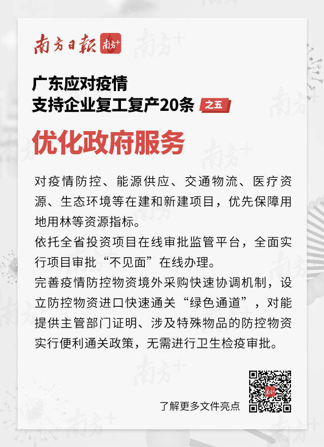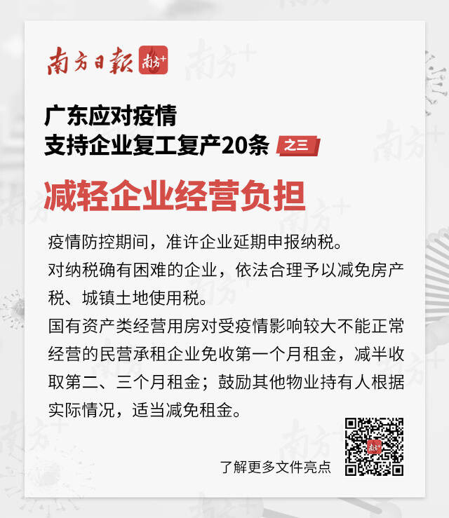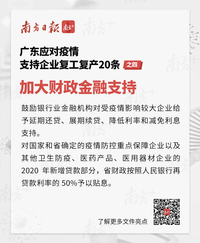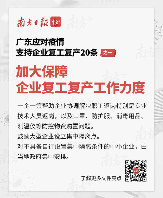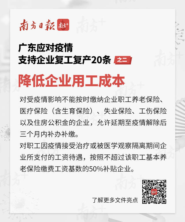 2月6日下午,广东省政府正式印发《关于应对新型冠状病毒感染的肺炎疫情支持企业复工复产的若干政策措施》,从进一步加大保障企业复工复产工作力度、降低企业用工成本、减轻企业经营负担、加大财政金融支持、优化政府服务等关键环节,提出了5方面共20项政策措施,全力支持和推动受疫情影响的各类企业复工复产。