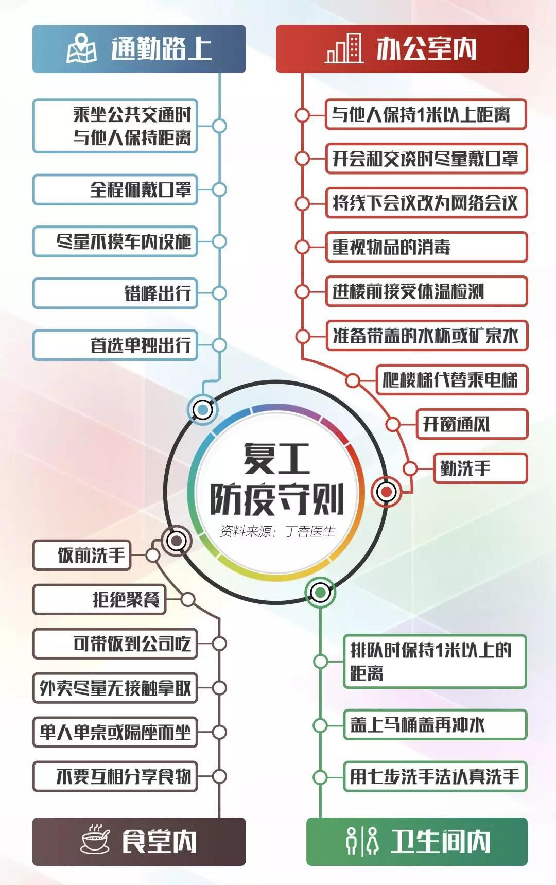 必须做好生产办公场地、员工居住地的通风、消毒和卫生管理及隔离区管控等工作,每日监测员工身体状况。按照《公众预防新型冠状病毒传染的肺炎疫情指南(企业年后返工人员)》“8个一”要求,做好防疫及安全知识宣传培训。鼓励实行错峰上下班,采取网上办公、视频会议、分散就餐等措施,降低人员流动和集聚风险。