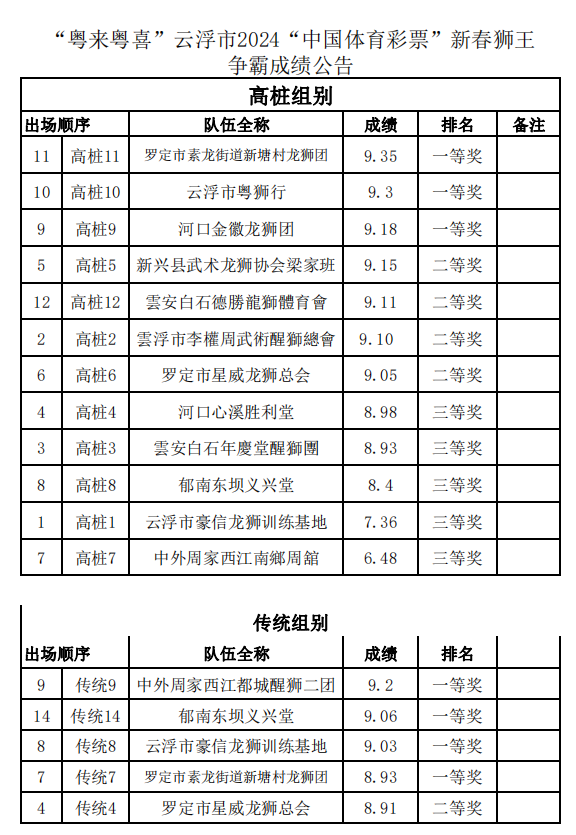 3月3日,粤来粤喜·云浮年2024“中国体育彩票”新春狮王争霸赛在市体育公园鸣鼓开锣,来自全市各县(市、区)28支队伍同台争夺狮王宝座。经过激烈比拼,中外周家西江都城醒狮二团等4支队伍获传统南狮项目一等奖,罗定市素龙街道新塘村龙狮团等3支队伍获高桩自选项目一等奖。