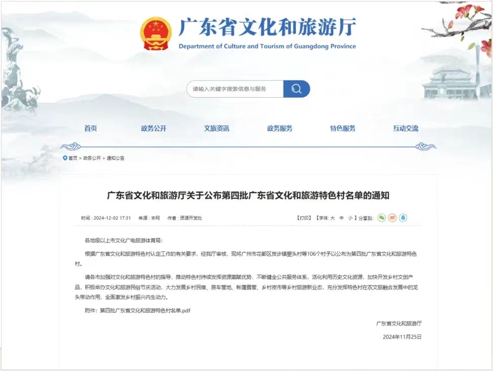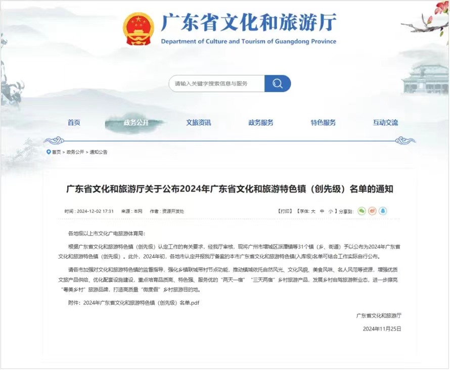 获评2024广东省文化和旅游特色镇(创先级)名单;