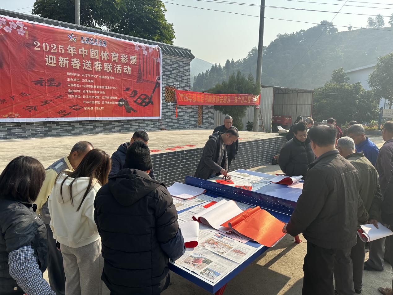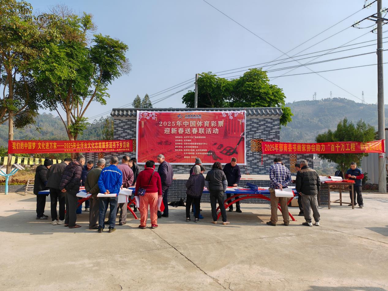 1月7日,正值传统腊八佳节,一场别开生面的“2025年中国体育彩票迎新春送春联”公益活动,在郁南县建城镇白瓦村文化广场温馨上演。本次活动由市文化广电旅游体育局组织下属单位云浮画院、市体育彩票发行中心、市博物馆、市图书馆等举办,旨在弘扬中华优秀传统文化,助力云浮市“百千万工程”走深走实,为乡村居民送上美好的祝福。