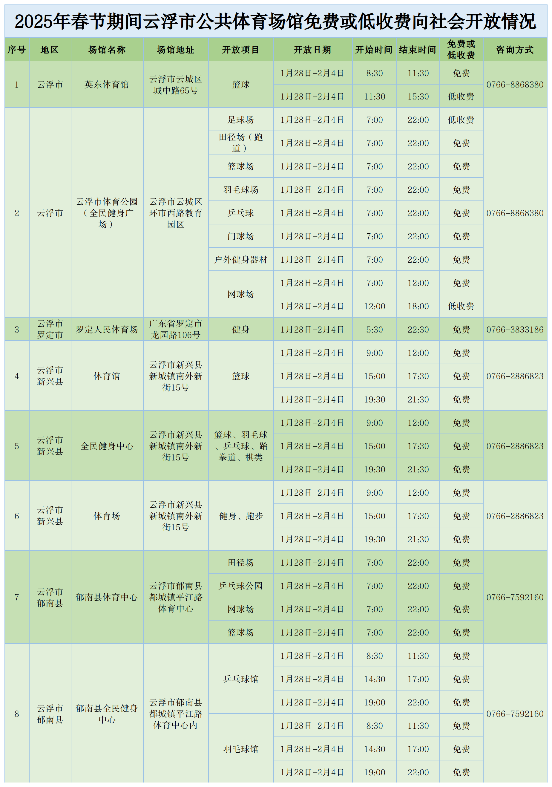 为更好满足广大市民群众春节期间健身需求,扩大体育惠民受益群体,春节期间,云浮这些公共体育场馆,将向社会免费或低收费开放。具体安排如下: