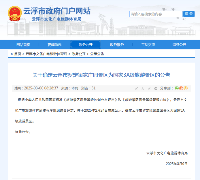 近日,根据中华人民共和国国家标准《旅游景区质量等级的划分与评定》和《旅游景区质量等级管理办法》,云浮市文化广电旅游体育局按程序组织综合评定,罗定市长岗坡文化休闲旅游区与梁家庄园景区正式获评国家3A级旅游景区。两家景区的升级丰富了云浮旅游资源的高品质供给,更以“红色文化+历史遗产”的特色元素,为游客提供多元化的文旅体验。