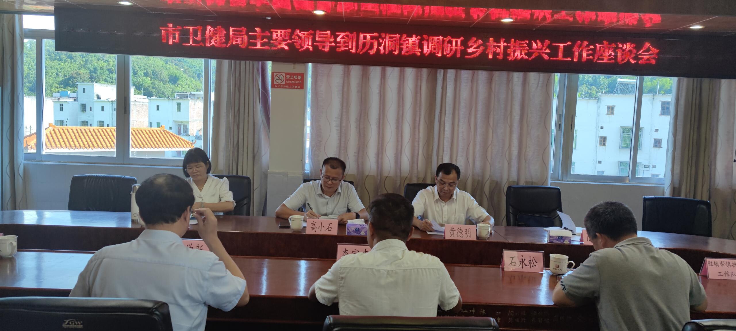 在随后召开的座谈会上,调研组听取了历洞镇领导关于镇域社会经济发展的基本情况,以及驻镇工作队队长关于驻镇帮镇扶村工作进展情况等。在听取相关汇报后,高小石同志对历洞镇驻镇帮镇扶村工作所取得的阶段性成效表示了肯定,并强调要继续深入学习贯彻习近平总书记关于“三农”工作的重要论述精神,对标上级部署要求,持续发力,不断推动乡村振兴工作取得新进展。一要抓好巩固脱贫攻坚成果工作。要抓细抓实防止返贫监测的日常工作,及时发现风险隐患,及时落实帮扶措施,坚决守住不发生规模性返贫的底线。二要抓好乡村振兴项目的发展。要发挥党建引领作用,结合镇情、村情做好乡村振兴项目的规划、谋划,用项目带动镇、村发展,不断完善各项基础设施建设;要充分利用现有资源聚力打造“一村一品、一镇一业”,不断壮大镇域经济和村级集体经济。三要体现行业帮扶的特色。要发挥卫生健康行业优势,在疫情防控、专家下乡、健康科普、义诊等方面提供便民服务,努力打造卫生健康帮扶亮点。