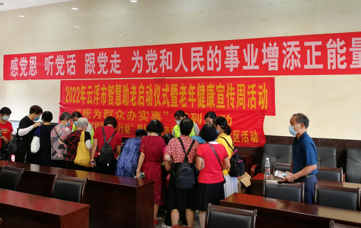 7月26日上午,云浮市2022年智慧助老暨老年健康宣传周主题活动在市老干部大学举行启动仪式。活动由市老龄办、市卫生健康局、市中医药局联合主办,市委老干部局、市老干部大学、市卫生健康服务中心、中国人寿保险公司云浮分公司等单位共同参与。今年老年健康宣传周活动的主题是“改善老年营养,促进老年健康”,活动时间是7月25日至31日。
