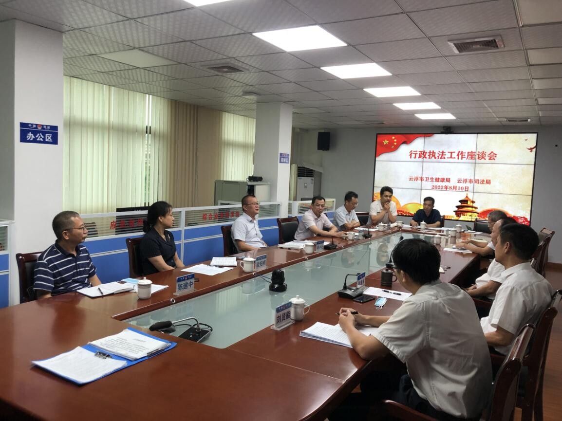 为规范卫生健康行政执法行为,提高行政执法效能,8月10日,市卫生健康局党组书记、局长高小石带队,市卫生健康局党组成员、副局长黄德明,市卫生监督所所长欧阳明及市卫生健康局、市卫生监督所相关业务人员一行8人到市司法局开展行政执法工作座谈。市司法局党组书记、局长黄志辉,市司法局党组成员、副局长何卓州及行政执法协调监督科相关人员参加了座谈。