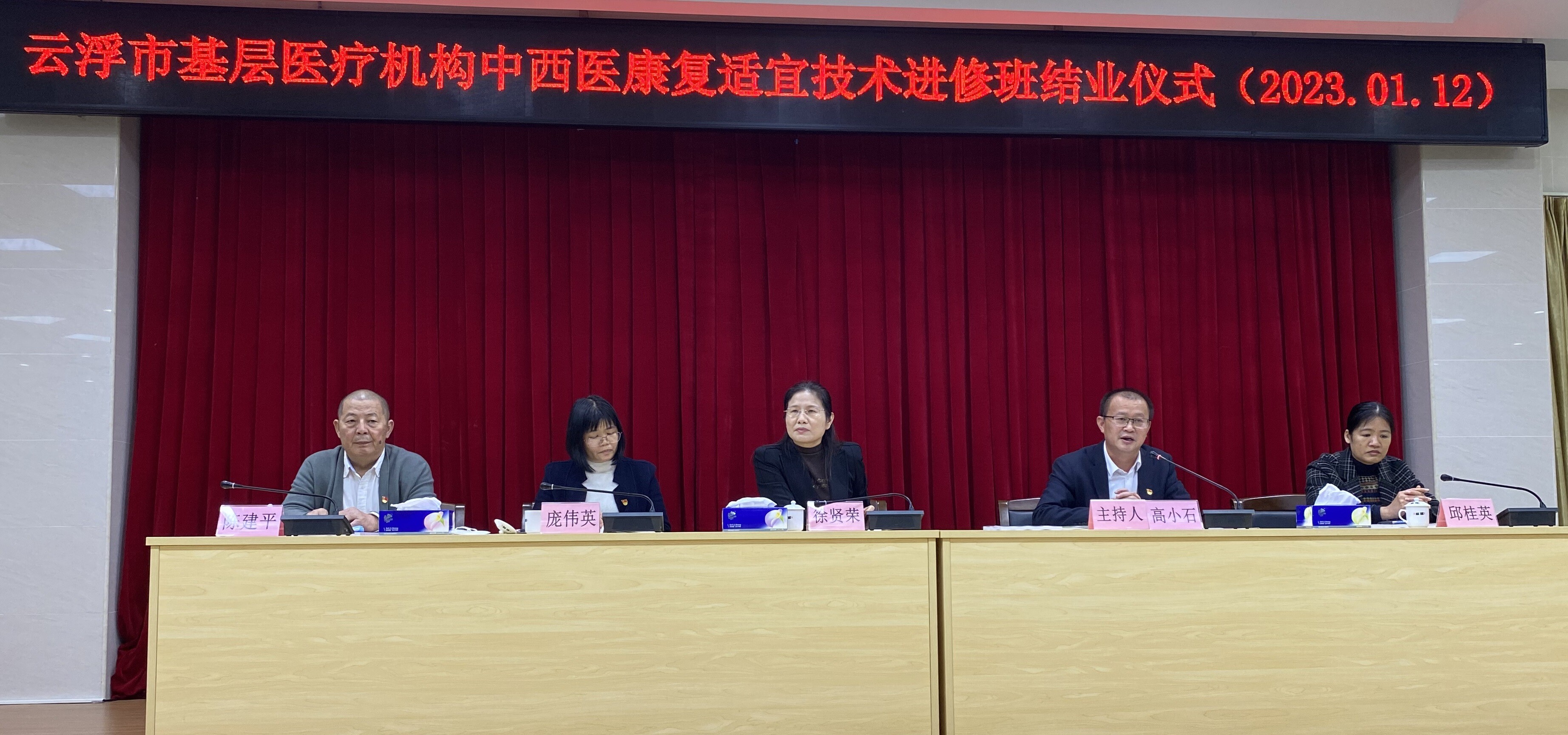 1月12日下午,云浮市基层医疗机构中西医康复适宜技术进修班结业仪式在郁南县第二人民医院举行,世界杯投注官网徐贤荣副市长出席并讲话。结业仪式由云浮市卫生健康局局长高小石主持,郁南县人民政府副县长邱桂英,授课专家陈建平、陈红霞、胡明一教授,郁南县卫生健康局主要负责人、郁南县第二人民医院领导班子及全体进修班学员参加了结业仪式。