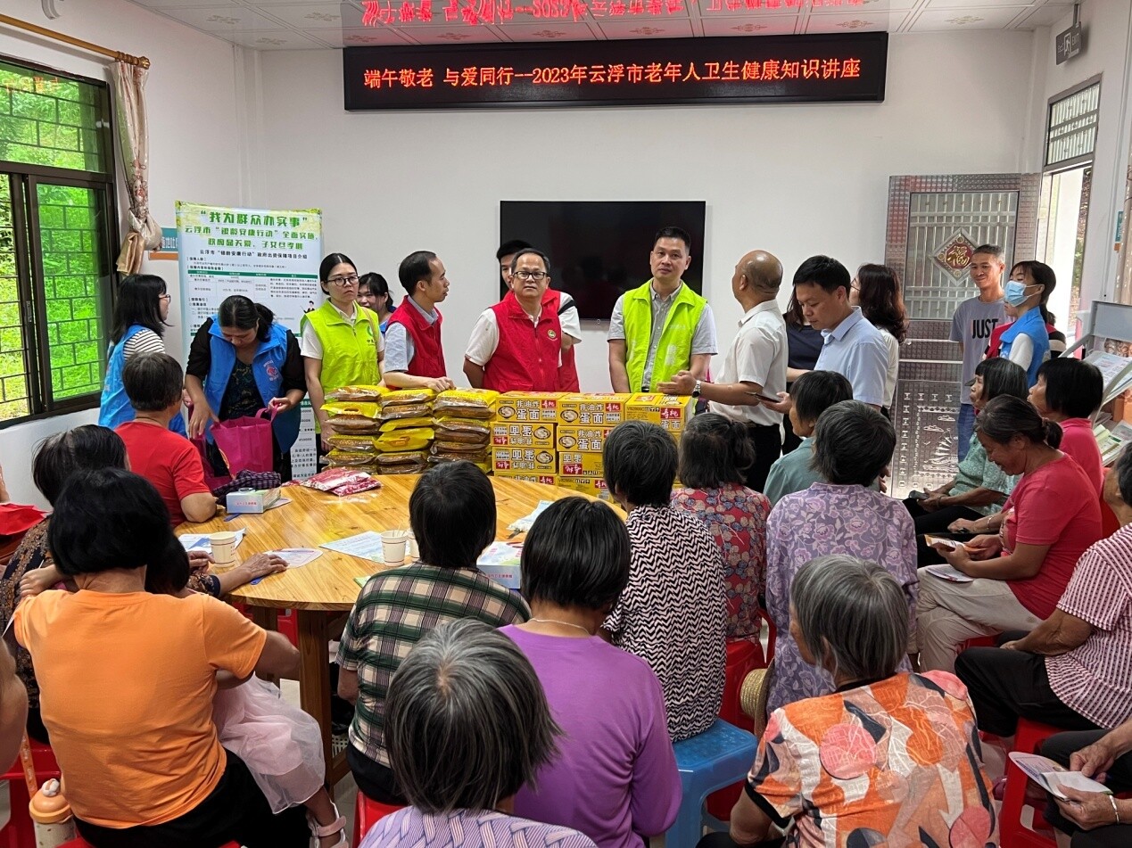 6月19日上午,云浮市卫生健康局在云安区富林镇云利村委开展端午节关爱老年人暨“银龄安康行动”宣传活动。本次活动由云浮市卫生健康局、广东省健康教育志愿服务队云浮分队主办,市卫生健康服务中心、中国人寿保险股份有限公司云浮分公司、云安区卫生健康局、云安区富林镇人民政府、云安区富林镇卫生院协办,云安区富林镇云利村委承办。