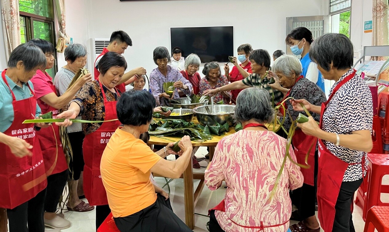 (图3:志愿者和老年人包粽子)