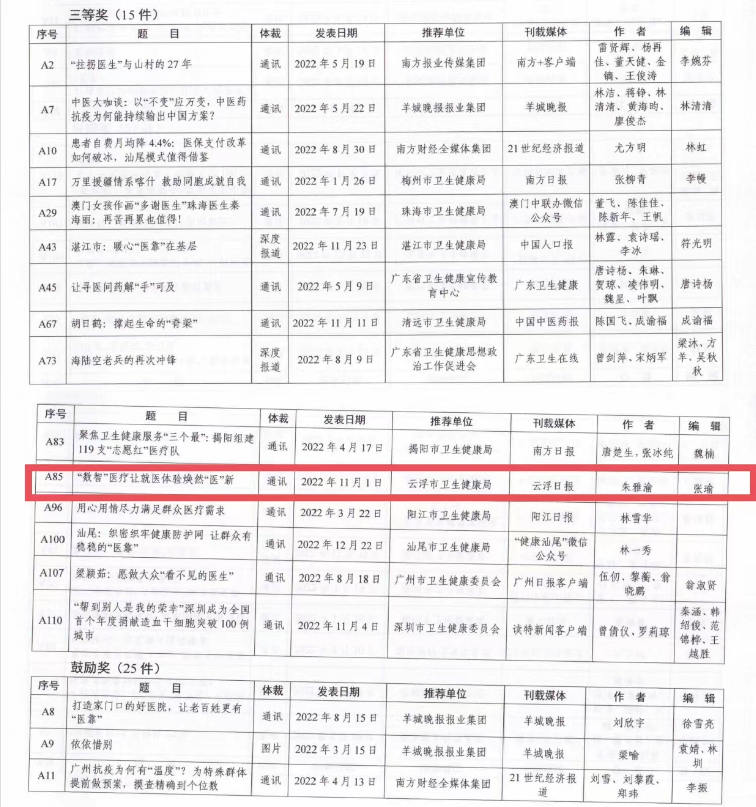 近日,广东省卫生健康委、广东省新闻工作者协会联合印发《关于广东省第九届卫生健康好新闻评选结果的通报》(粤卫宣传函〔2023〕3号),云浮市卫生健康局选送新闻作品朱雅渝《“数智”医疗让就医体验焕然“医”新》在广东省第九届卫生健康好新闻评选活动中荣获“三等奖”。