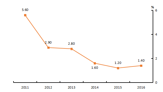 2016全市居民消费价格总指数累计上涨1.4%。分类别看,食品烟酒类价格上涨4.2%,其中粮食下降0.1%,菜类上涨 15.6%,畜肉类上涨11.6%,禽肉类上涨1.5%,水产品上涨0.9%,蛋类下降4.7%,烟酒上涨0.8%;衣着类价格上涨1.1%;居住类价格下降2.4%;生活用品及服务类价格上涨0.3%;交通和通信类价格下降1.5%;教育文化和娱乐类价格上涨0.9%;医疗保健类价格上涨5.6 %;其他用品及服务类价格上涨2.8%。工业生产者价格指数同比下降1.07%。