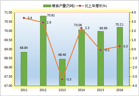 2016年,全市粮食作物播种面积11.77万公顷,比上年增长0.3%。稻谷种植面积8.87万公顷,下降0.1%;油料种植面积2.01万公顷,增长0.6%;蔬菜种植面积2.71万公顷,增长2.5%。
