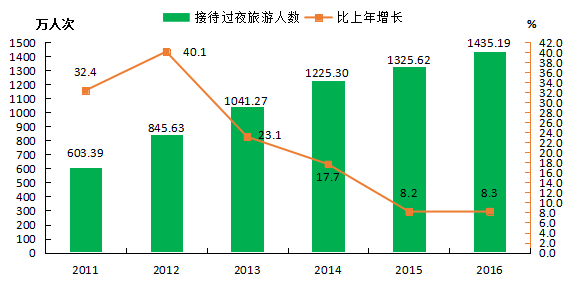 全年旅游总人数2304.54万人次,增长11.7%。其中,住宿设施接待过夜游客1435.19万人次,增长8.3%。按国内外分,国内游客2287.76万人次,增长11.8 %;入境游客16.78万人次,增长8.6%。旅行社组团国内游5.55万人次,增长42.84%;组团出境游1799人次,增长降 48.55%。全年旅游总收入233.29亿元,增长8.7%,其中旅游外汇收入4823.09万美元,增长7.3%。