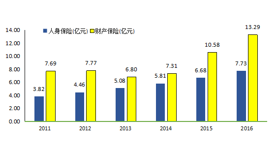 全年各类保险业总保费收入21.02亿元,同比增长21.7%。其中,寿险业务保费收入13.29亿元,占总保费63.2%,同比增长25.6%;财产险业务保费收入7.73亿元,占总保费36.8%,同比增长15.6%。全年共赔付4.53亿元,共给付2.37亿元。其中,寿险保险赔付1.30亿元,给付2.37亿元;财产险赔付3.24亿元,赔付率41.9%,其中车险赔付2.57亿元,赔付率42.8%。