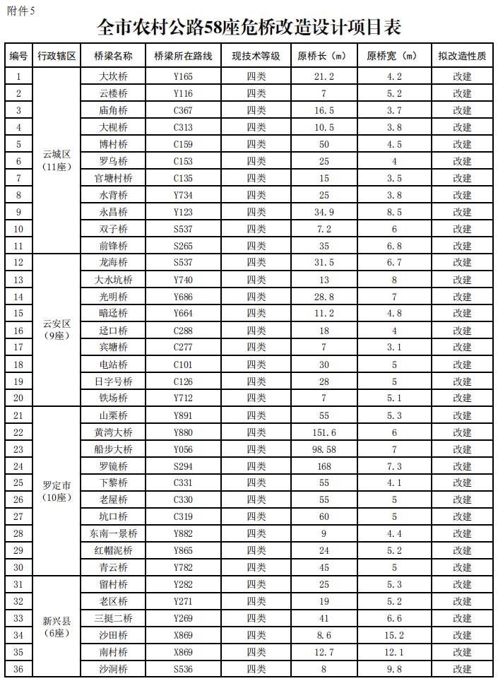 2.市定攻坚任务。一是完成镇通行政村路面拓宽175.27公里,全面实现所有镇通行政村公路路面4.5米以上;二是完成58座危桥设计工作,实现我市农村公路危桥库现有危桥处治率100%,同时完成其中15座危桥的施工改造建设。