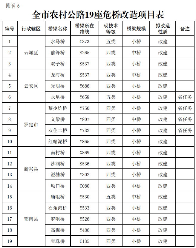 1.上级补助资金。根据省“四好农村路”建设攻坚方案确定的补助标准,我市属II档标准,结合之前上级已下达的部分补助资金(粤交规〔2019〕791号、粤交规划字〔2019〕307号、粤交规〔2020〕114号等),以及后续继续争取15座危桥补助资金,本次省、市建设攻坚任务的上级补助资金预估约31238万元(以实际下达到位为准)。此外,之前已下达的新增养护资金2794万元(含罗定市、新兴县资金,含贫困村路面硬化资金),可统筹用于本次建设攻坚任务。