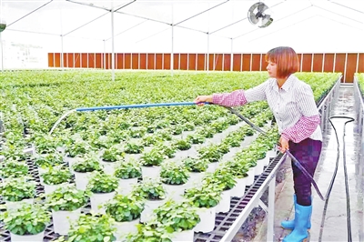 高村镇花卉基地员工在为种苗浇水 (资料图片)