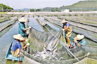 东成镇全面深化支部建在产业链、党员聚在产业链、人才育在产业链、农民富在产业链“四链”联农带农机制,创新构建“党支部+专业协会(合作社)+农户”“党支部+产业基地+农户”等多元发展模式,先后成立东利渔业、沃田农业等党支部,引导农民成立专业合作社,都斛村东利渔业专业合作社养殖罗非种鱼达5万条(如图),招引带动超100名社员实现致富梦想,每户年收入增收超9万元。都斛村沃田蔬菜基地种植面积达300余亩、云河村廻龙农机专业合作社盘活土地80多亩等等,各村以出租等方式“唤醒”农村土地、资金、技术等资源,为村集体增收收入,带动农户在家门口就业。此外,紧紧把握新型农村集体经济发展的良好机遇,占地面积达6万平方米、投资4100万元的扶桂村“政银企村户”共建家庭农场顺利投产,投产后年产量可达375万羽,带动10个自然村集体经济年增收10万元,50名农民就近就业增收。
