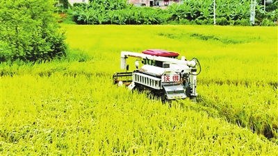 在平台镇新乐村500亩的水稻种植基地,金黄的稻浪翻滚,收割机正开足马力抢收早稻。郁南县坤为农业有限公司种植主管夏孝富介绍,今年基地选种优质品种“青香优19香”,并首次应用超声波技术处理稻种,显著提升了稻谷品质和产量。