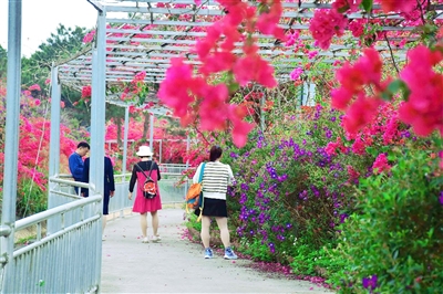 除了春日限定的“黄金信使”,园内数百米长的花廊中,巴西牡丹花也开得正艳。抬头望去,牡丹花或红如火,或粉似霞,在春风中时而摇曳生姿,时而落英缤纷,令人陶醉。杜鹃花、火焰木、宫粉紫荆、紫花风铃等花卉竞相绽放,一片连着一片,红的、黄的、粉的、紫的各色鲜花绵延盛开,形成“一路生花”的壮丽景象。