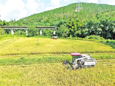 本报讯 (云浮融媒记者 黄洋 通讯员 雷程 何咏琪) 近日,新兴县河头镇“河头香米”种植基地迎来早造水稻丰收季,百亩优质稻田全面收割。记者在河头镇湾中村委小洞村看到,3台收割机开足马力来回穿梭于金黄稻田间,正争分夺秒收割今年的第一批香米(如图)。
