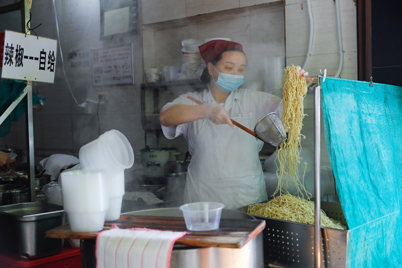 4月22日,武汉市粮道街的家阳“赵师傅”天天红油热干面店厨师在制作热干面。新华社记者 沈伯韩 摄